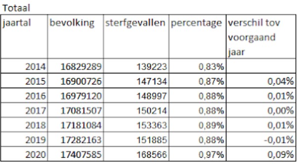 Maar goed, dat zijn alleen sterftecijfers. De bevolking groeit ook aanzienlijk per jaar, dus is het wel zo eerlijk om ook te kijken naar het percentage sterfte ten opzichte van het bevolkingsaantal (klik op de afbeelding voor een groter formaat). Daarin is een stijging van 0,09% te zien ten opzichte van het voorgaande jaar. Dat lijkt een klein percentage, maar dat percentage vertegenwoordigt bijna 15.700 mensen.