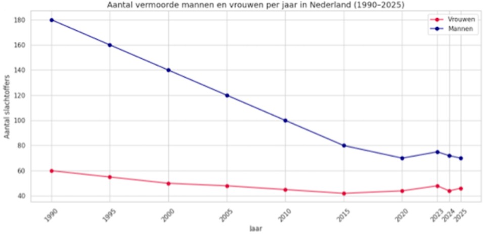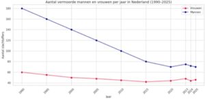 Het aantal mannelijke geweldsdoden in Nederland is sinds de jaren 90 significant afgenomen, maar dat is niet het geval bij vrouwelijke geweldsdoden: die afname is maar heel licht (onderaan dit artikel kun je een grafiek vinden). In de jaren 90 werden er gemiddeld vijf vrouwen per maand vermoord, dus iets meer dan één per week. In 2023 kwam er gemiddeld elke week een meisje of vrouw om het leven door geweld. Op dit moment wordt er elke acht dagen een meisje of vrouw vermoord. Nederland behoort tot de West-Europese landen met de hoogste femicidecijfers per capita, en de daling blijft achter bij die in andere Europese landen.