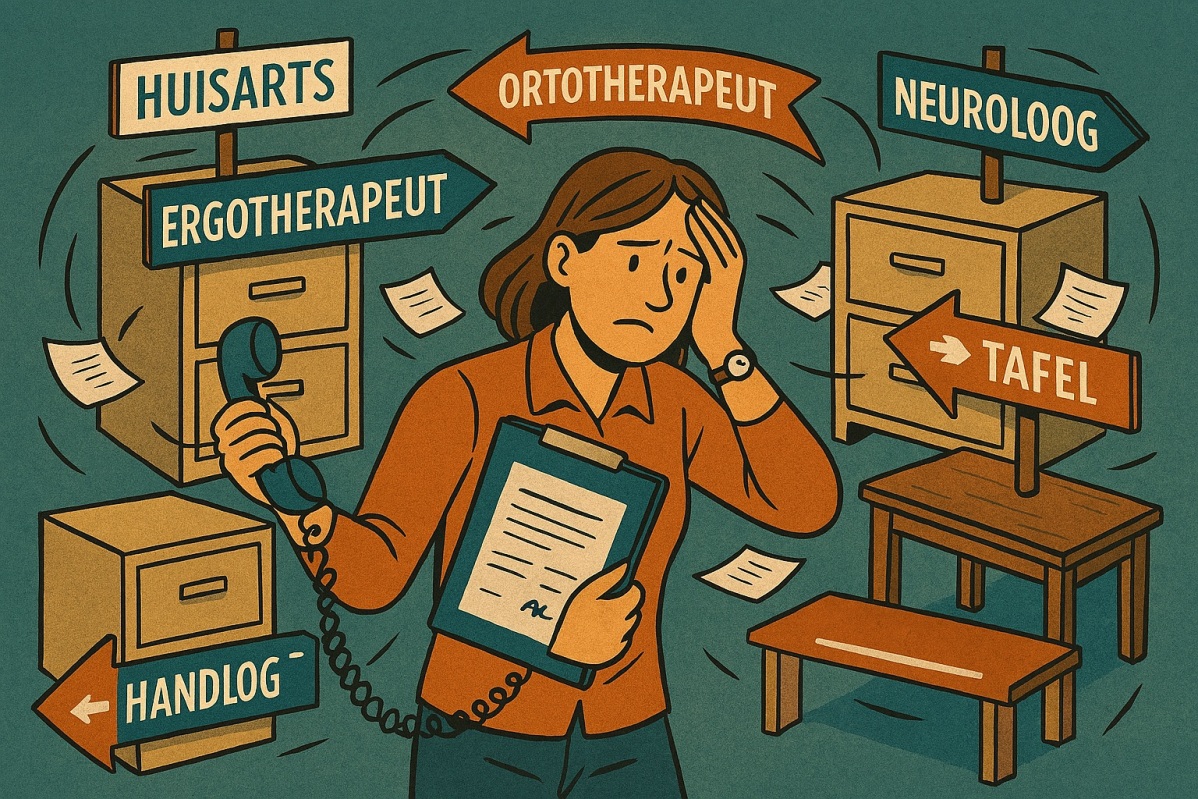 Later die middag belde ik het opgegeven nummer en legde uit waar ik voor belde: ik wil graag een afspraak maken, want mijn vader heeft een handspalk nodig. “Oh maar dat kan zomaar niet hoor. Heeft u een doorverwijzing van een specialist?” Nou ja, ik heb een doorverwijzing van zijn huisarts en ergotherapeute, telt dat? “Nee, dat zijn geen specialisten, het moet een neuroloog zijn.” Ik voorzag weer weken wachten op een afspraak, ondernemingen naar de neuroloog in het ziekenhuis, weer een nieuwe doorverwijzing. Ik legde haar mijn verbazing uit, het is toch raar dat we weer terug moeten naar de neuroloog voor zoiets simpels, als allang bekend is dat mijn vader halfzijdig verlamd is en hersenletsel heeft? Hij verbleef nota bene maanden in het revalidatiecentrum. “Oh, maar dát zei u er niet bij.” Nee muts, je vroeg er ook niet naar, dacht ik. Je gaat meteen ergens van uit zonder eerst door te vragen. Gelukkig veranderde mijn uitleg de zaken: we kregen een afspraak op een ‘gecombineerd spreekuur’: de revalidatiearts en de instrumentmaker zijn dan beiden aanwezig zodat alles meteen geregeld kan worden – hoop ik.